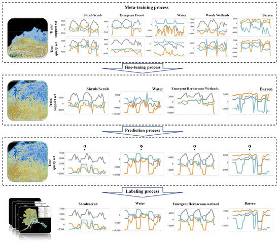 In this research, we developed a novel method, the RSMA-based training data method, to automatically produce reliable training data at any location for mapping Alaska’s land cover. The method integrated the meta-training and fine-tuning techniques to refine the land cover labels compared with the labels from the NLCD products. The RSMA-based training data method demonstrates the potential for using the produced training data to generate high-quality land cover maps especially for regions like Alaska. The RSMA-based training data method is tailored to address the scarcity of training data with limited prior knowledge. Furthermore, our research examined the effects of basic machine learning models (1D-CNN vs. UNet) on training the global model in the meta-training process and sampling strategies (equal-number strategy vs. simple random sampling) on updating model parameters in the specific region in the fine-tuning process. Based on the results, we have provided insights and guidelines for using the method in different scenarios. Our research results indicate that for less complex classes such as Anderson Level I classification legend, 1D-CNN as the basic model choice in the RMSA method derived a higher OA, whereas UNet as a basic model derived higher OA for more complex classes such as Anderson Level II classification legend. Additionally, the OA was highest using simple random sampling for transferring the pretrained model.