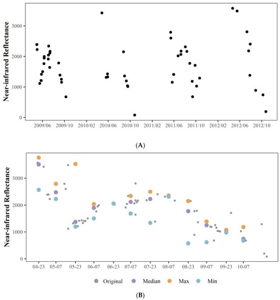 Temporal trends (A) and semi-monthly NIR composition (B) of the NIR reflectance values (2009–2012). The reflectance values were scaled by a factor of 10,000.