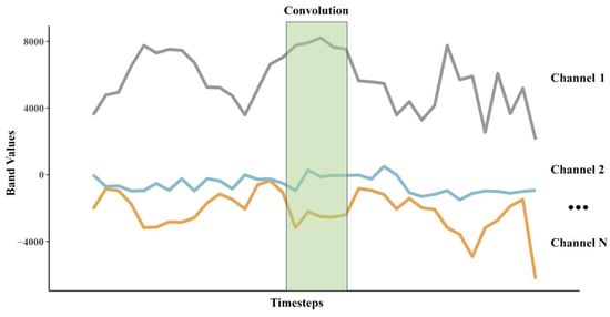 The meta-training process is the same as in the Model-Agnostic Meta-Learning (MAML) method [52], in which the meta-training dataset is partitioned into 80% (train) and 20% (test). As shown in Figure 3, each variable of the meta-training set was input as an individual channel of the model. The convolutional kernel moved from the beginning of the median values toward the minimum of the values, accommodating the following three distinct patterns: median, maximum, and minimum time series. PALSAR data were integrated as an individual channel in this process. The training procedure was divided into an inner loop and an outer loop. The neural network parameters, , were iteratively optimized by gradient descent [53] after being randomly initialized. In the inner loop, the basic model (1D-CNN or UNet) was trained with a batch size of 512 sample units from the data. The parameters, , of the model were updated to each task via gradient descent on the data. The outer loop then refined the parameters, , based on the performance of model on data with a batch size of 512 sample units.