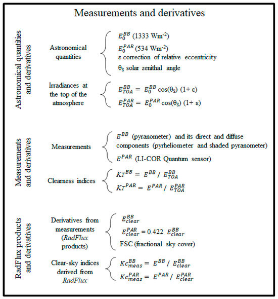 Other quantities were computed mostly for the purposes of validation. Astronomical quantities, namely the correction of relative eccentricity and the solar zenithal angle θS, were obtained using the SG2 algorithm [62]. The yearly-averaged irradiances emitted by the sun and reaching the top of the atmosphere on a plane normal to the direction of the sun rays and were calculated using a proper integration of the solar spectrum newGuey read from the libRadtran radiative transfer model [63,64] and then resampled to 5 nm and adjusted to the nominal total solar irradiance of 1361 W m−2 as recommended by [65]. Thus, was set to 1333 W m−2 in the broadband range [280, 3000] nm, and its PAR fraction was set to 534 W m−2. The irradiances and at the top of the atmosphere were computed, as well as the clearness indices KtBB and KtPAR. Figure 2 provides an overview of the astronomical quantities, measurements, and their derivatives used in this study.