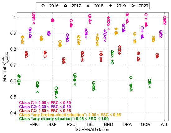 Figure 3 exhibits the mean of for each subset. As expected, the means for each subset vary with the year and the station, though in a limited manner, on the order of ±0.10. The means are the greatest for the C1 class (0.05 < FSC ≤ 0.30): they are greater than 0.9 and close to the clear-sky values. The means are around 0.90 for the C2 class (0.30 < FSC ≤ 0.60), 0.75 for the C3 class (0.60 < FSC < 0.95) and around 0.85 for the “any broken-cloud situation” class (0.05 < FSC ≤ 0.95). The smallest means are observed for the “any cloudy situation” class, which includes overcast conditions, and are less than 0.65 with the exception of Desert Rock (DRA), where the means range between 0.7 and 0.8.