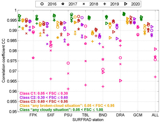 In addition to the measurements, several “RadFlux” products were downloaded through the SURFRAD server, namely the clear-sky broadband irradiance , the fractional sky cover, and the flag “ClrF”, which is equal to 1 or 0 for a measurement operated under clear-sky or cloudy-sky conditions, respectively. The fractional sky cover (FSC) discriminates overcast situations from broken-cloud situations. For more detailed information on FSC estimates, please refer to Long et al. [58]. An FSC greater than 0.95 means overcast conditions, while an FSC less than 0.95 and greater than 0.05 refers to broken-cloud conditions. The lower the FSC, the more fragmented the cloud cover.