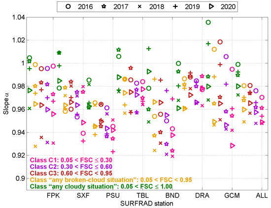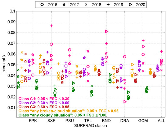 The correlation coefficients between and were computed for each data subset and plotted in Figure 4. As a whole, they are greater than 0.96 whatever the subset, showing that and are strongly related. The correlation coefficients are the smallest for the smallest FSC (C1 class), then for the C2 and C3 classes. The coefficients are greater than 0.99 for the “any cloudy situation” class. The least-squares fit between and produced a series of affine functions, = α+β, which differ from one subset to another. Figure 5 and Figure 6 exhibit the slopes and intercepts for each subset. The slopes (Figure 5) range from 0.92 to 1.04; they are highly variable from station to station for a given year and a given class, from year to year for a given station and a given class, and from class to class for a given station and a given year. The intercepts (Figure 6) are also highly variable within the set of stations, the years, and the five classes. They range from 0.015 to 0.085 and, as a whole, are approximately 5% of the means of in each class.