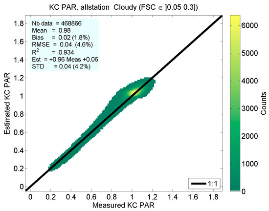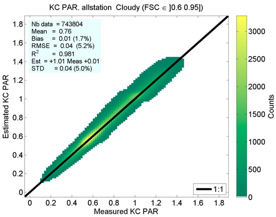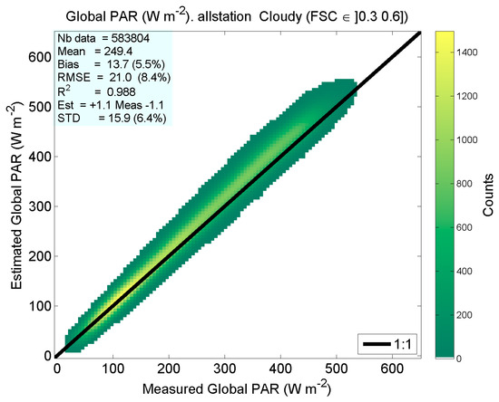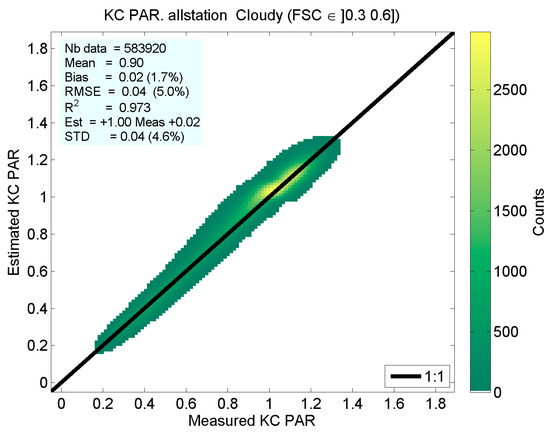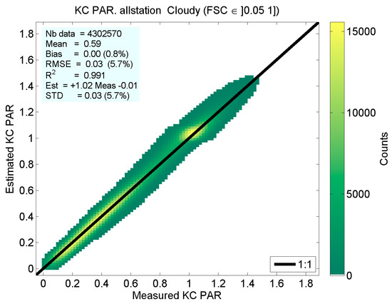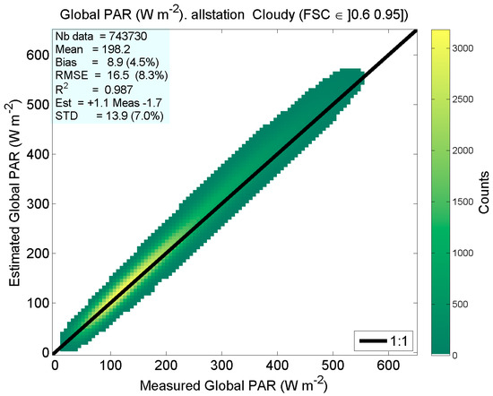 Next, obtained by Equation (4) is converted in by using this new set of . As previously, the combination of the clear-sky model and the WN2024 model is assessed by comparing estimates against reference data. To better understand the results, three assessments are presented using the clear-sky index, the PAR, and the PAR clearness index, respectively. More precisely, the first assessment compares the estimates of against , the second one deals with against and the third one with against . Relative bias, standard deviation, and RMSE were computed with respect to the means of , , and . Figure 15, Figure 16, Figure 17, Figure 18, Figure 19 and Figure 20 exhibit the 2D histograms of measured PAR and estimated PAR for the six classes, all stations merged. Table 4, Table 5 and Table 6 give the means, correlation coefficients, errors, and slopes of the fitting lines for each of the six classes, all stations merged, for , and , respectively.