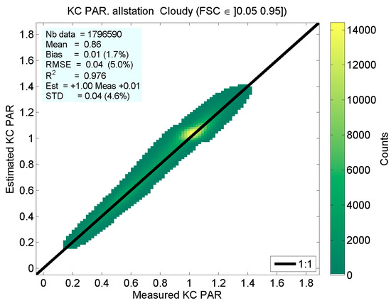 The 2D histogram of measured PAR (horizontal axis) and estimated PAR (vertical axis) for the class ]0.05, 1.00] (any cloudy), all stations merged. The color bar indicates the number of pairs in each class.