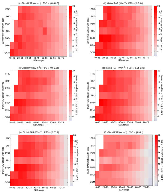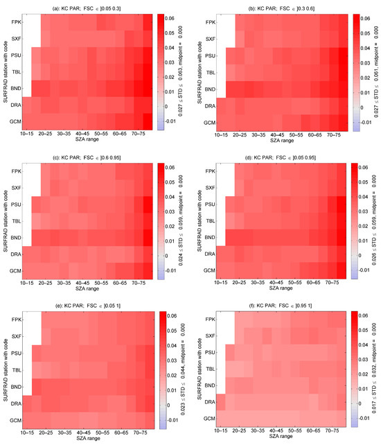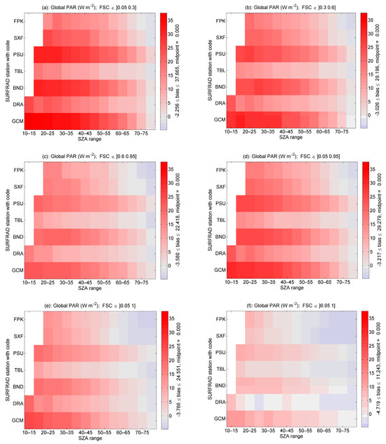 When the PAR clear-sky model of [38] is used in combination with the WN2024 model, it was found that the result tends to overestimate the PAR measured at the SURFRAD stations as the FSC decreases, i.e., when fewer and fewer scattered clouds are present. The bias is equal to 1 W m−2 in overcast conditions, up to 18 W m−2 when the FSC is small, and 6 W m−2 when all cloudy conditions are merged. The RMSEs are 5, 24, and 15 W m−2, respectively. This may be different from other PAR clear-sky models.