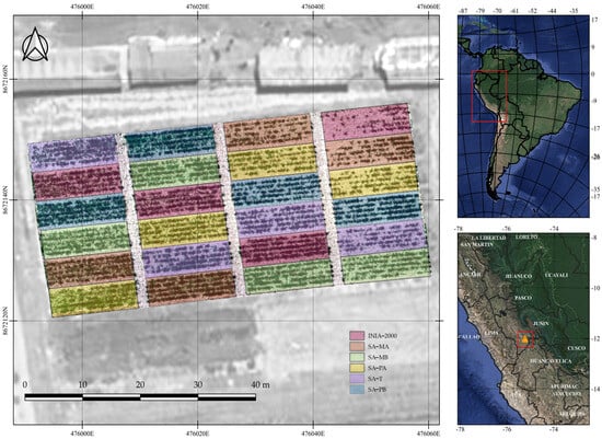 The field experiment was conducted at the Santa Ana Agricultural Experimental Center (hereafter referred to as Santa Ana), part of the National Institute of Agrarian Innovation (INIA) (75°13′17.60″W, 12°0′42.36″S), located in the Mantaro Valley in the central highlands of Peru. Santa Ana is situated at an altitude ranging from 3303 to 3325 m above sea level. The region’s climate is characterized by a rainy season from November to March, a transitional phase from April to October, and a dry season from May to August, with a total annual precipitation of 477 mm [45]. Average temperatures range from 3.90 to 20.2 °C, with the lowest temperatures and frequent frosts occurring between May and August [46,47].