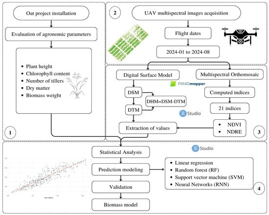 Accurate and timely estimation of oat biomass is crucial for the development of sustainable and efficient agricultural practices. This research focused on estimating and predicting forage oat biomass using UAV and agronomic variables. A Matrice 300 equipped with a multispectral camera was used for 14 flights, capturing 21 spectral indices per flight. Concurrently, agronomic data were collected at six stages synchronized with UAV flights. Data analysis involved correlations and Principal Component Analysis (PCA) to identify significant variables. Predictive models for forage biomass were developed using various machine learning techniques: linear regression, Random Forests (RFs), Support Vector Machines (SVMs), and Neural Networks (NNs). The Random Forest model showed the best performance, with a coefficient of determination R2 of 0.52 on the test set, followed by Support Vector Machines with an R2 of 0.50. Differences in root mean square error (RMSE) and mean absolute error (MAE) among the models highlighted variations in prediction accuracy. This study underscores the effectiveness of photogrammetry, UAV, and machine learning in estimating forage biomass, demonstrating that the proposed approach can provide relatively accurate estimations for this purpose.