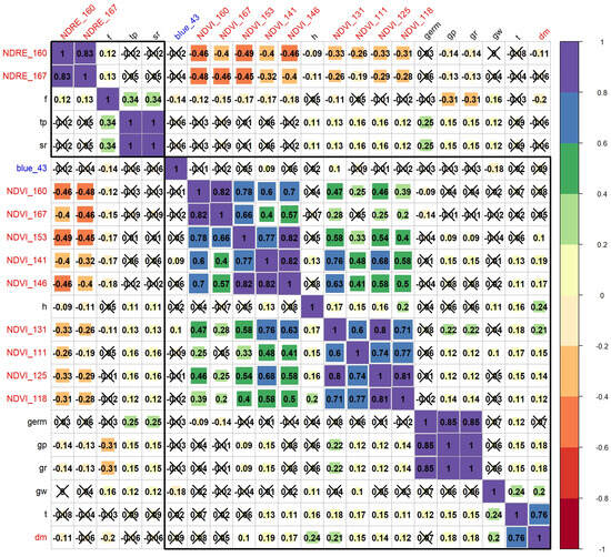 The correlation matrix (Figure 4) displays Pearson correlation coefficients between agronomic variables and filtered spectral indices, calculated using the Corrplot library for Wei T [86], reflecting their linear relationships. Matrix values range from −1 to 1, where 1 indicates a perfect positive correlation, −1 is a perfect negative correlation, and 0 is no correlation. The main diagonal of the matrix always holds 1, as each variable correlates perfectly with itself.