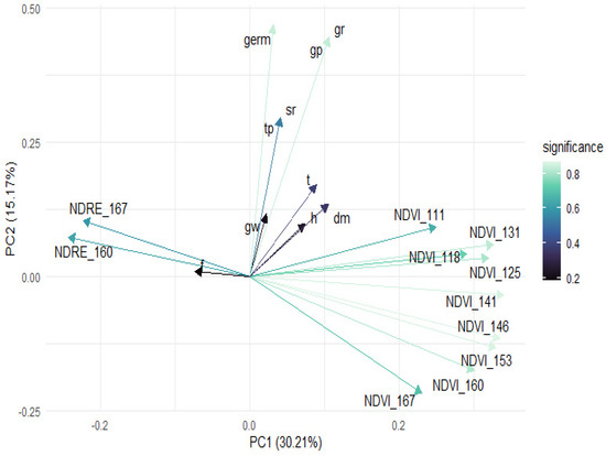 Variables NDRE_167 and NDRE_160 are negatively correlated with PC1, whereas NDVI variables (111, 118, 125, 131, 141, 146, 153, 160, 167) contribute significantly and positively to PC1. Other variables such as germ, gp, gr, sr, tp, t, gw, hr, and dm contribute to PC2 to varying degrees. The color of the arrows reflects their significance level, with darker colors indicating greater significance.