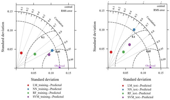 Figure 6 shows two Taylor diagrams illustrating the performance of the models used to estimate dry matter: linear regression, Neural Network, Random Forest, and Support Vector Machine. Each point on the graph represents the accuracy of these models in terms of standard deviation, correlation coefficient, and root mean square error (RMSE) for both the training and test datasets. In the test set, the Support Vector Machine shows strong performance with a correlation coefficient (r) of 0.93, followed by the Neural Network model with an r of 0.91, indicating high precision in predicting dry matter (dm).