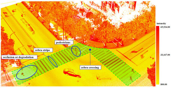 LiDAR point clouds can be acquired through various means, including airborne, vehicular, and backpack systems. To balance efficiency and minimize the impact of occlusions, this study focuses on LiDAR point clouds obtained from vehicle-mounted Mobile Laser Scanning (MLS) systems. MLS typically consists of high-precision laser scanners, Global Navigation Satellite Systems (GNSSs), Inertial Measurement Units (IMUs), cameras, odometers, and other sensors mounted on mobile platforms such as vehicles or Unmanned Aerial Vehicles (UAVs), along with the necessary data processing software. It operates independently of external lighting conditions, making it effective even at night or in low-light environments, and can penetrate clouds and some vegetation [16]. Utilizing multi-sensor data fusion, MLS can rapidly, continuously, efficiently, and comprehensively acquire and process the high-precision, high-resolution 3D point cloud data of extensive surrounding areas while in motion [17]. This capability allows it to capture detailed surface features and complex terrain characteristics, making it particularly suitable for urban environments, transportation networks, rivers, and other hard-to-reach areas [18,19,20,21]. An example of urban intersection zebra crossings represented by LiDAR point cloud intensity is shown in Figure 1.