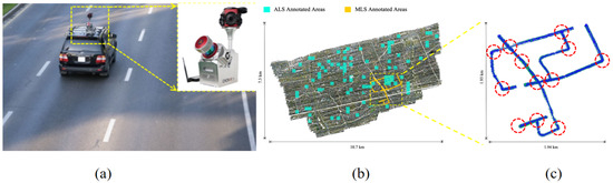 Study case. (a) AS-900HL multi-platform LiDAR measurement system. (b) Trajectory of the study case (Shanghai, China). (c) Distribution of zebra crossing areas used for experiments in the MLS-S point cloud.