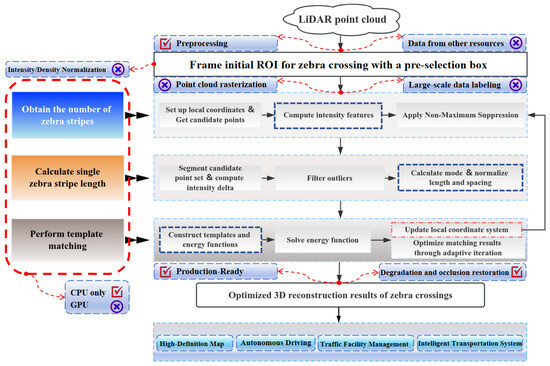 The earliest method for acquiring information on zebra crossings involved using paper maps and manual field inspections. These data were then either recorded in tables or annotated on maps, leading to high acquisition costs and long update cycles, with numerous uncontrollable factors. With the advancement of digital technology, people began using intersection surveillance footage combined with digital maps for on-demand verification and vectorized storage. However, the number of cameras, the quality of the photos, and traditional map representations constrained the completeness and precision of the acquired results. Currently, the maturity of remote sensing technology offers multiple possibilities for the rapid and efficient extraction and reconstruction of zebra crossings. These remote sensing data sources can be broadly categorized into three types: high-resolution remote sensing images [5,6,7], real-time photos or videos captured by intersection surveillance or moving vehicles [8,9], and LiDAR point clouds [10,11,12]. The characteristics of these data sources determine that extracting zebra stripe information from the first two requires extensive preprocessing with image processing techniques, which can help address issues such as exposure, distortion, and pixel differences. Even the more prevalent deep learning algorithms, despite their significant achievements, require a large amount of labeled data to handle complex road conditions and diverse environments. The generalization of these models remains a challenge, making it difficult to meet the high demands for the completeness and accuracy of extraction results in practical applications and rarely yielding high-precision elevation data for zebra stripes. In contrast, LiDAR technology, with its high-density, high-precision 3D point clouds, minimal impact from lighting and weather conditions, and distortion-free mapping, has become a focal point for research on extracting various terrain and feature elements [13,14,15]. In the extraction of zebra stripes from LiDAR point clouds, most studies convert point clouds into raster images to utilize established image processing techniques. However, this approach sacrifices the inherent advantages of point clouds, particularly neglecting the detailed exploration of their high-precision 3D and intensity information. Based on the above analysis, the limitations of current methods can be summarized as follows: (1) Conventional methods are time-consuming and labor-intensive, with limited update capability and restricted precision and quality. (2) Methods based on remote sensing images and real-time photos (videos) involve significant preprocessing. It is difficult to obtain high-precision elevation data, and the heterogeneity of the data weakens the generalization ability of deep learning models, making direct application in practical production challenging. (3) There is limited research directly using point clouds, as most studies convert them to raster images, inadequately exploring the 3D and intensity information. In summary, the 3D instantiation of zebra stripe extraction remains a challenging issue due to various limitations of the data sources.
