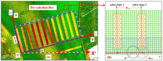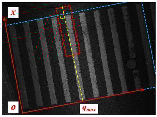 For ease of calculation and representation, we defined the direction along the long side of the zebra stripe within the pre-selection box as the x-axis, and the direction perpendicular to the x-axis as the y-axis. The z-axis aligns with the original coordinate system z-axis of the point cloud. Subsequently, we established a local coordinate system (as shown in Figure 4a). Within this local coordinate system, segmentation was performed at predetermined intervals along the y-axis. This resulted in the formation of the initial candidate coordinate point set, denoted as Q, which consists of points on the coordinate axis at each segmentation point. The energy of each was calculated, where is positively correlated with the reflection intensity of the nearby point cloud around . This energy represents the likelihood of being located near the central axis of the zebra stripe (Formulas (1) and (2)). From the candidate point set Q, the point with the maximum energy value, which is most likely to be near the centerline of the zebra crossing (as shown in Figure 4b), was continuously selected. Each selected point was recorded in the set . According to the principle of non-maximum suppression, the selected point and its neighboring candidate points were automatically removed from the candidate point set Q (as shown in Formula (3)), until no candidate points remained in Q. At this point, the number of points in corresponds to the number of zebra stripes in the selected area. Each candidate point position in serves as the initial position of each zebra stripe on the y-axis. At these positions, fixed-size regions are defined above and below along the y-axis direction. These regions represent independent areas that contain a single stripe of the zebra crossing.