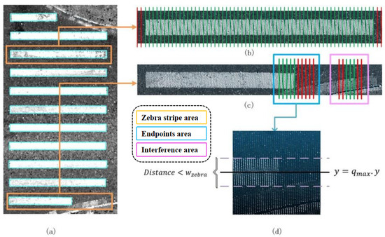 Zebra crossings are traffic markings that designate safe areas for pedestrians to cross roads. They typically consist of a series of parallel white or yellow stripes and play a crucial role in ensuring traffic safety, regulating traffic order, enhancing traffic efficiency, and improving the aesthetic appeal of roads. In the management, operation, and maintenance of smart city infrastructure, as well as in intelligent driving, smart transportation, assistive navigation for the visually impaired, and even in the construction of digital twins and the metaverse, the requirements for high-definition map foundations are becoming increasingly exacting [1,2,3]. Among these foundational elements, zebra crossings, which are usually not displayed or only symbolically represented on traditional maps, exhibit various forms (including differences in stripe length, width, color, material, and wear) and are located in complex traffic conditions, posing unique challenges for accurate depiction. To better and more precisely depict them, it is necessary not only to include them in high-definition maps but also to achieve three-dimensional instantiation at the stripe level [4].