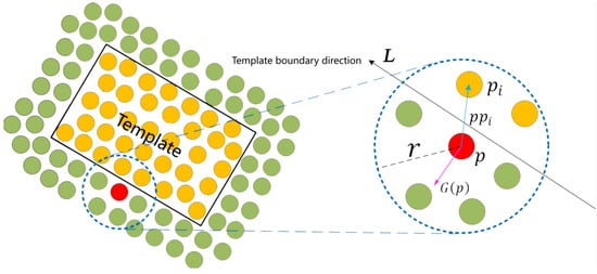 where P represents the three-dimensional coordinates of the center point of the zebra crossing, and represents the angle between the long side direction of the zebra crossing and the x-axis of the overall point cloud coordinate system; represents the average intensity of the point cloud covered by a polygon template composed of four ordered nodes of a zebra crossing, represents the intensity information entropy of the point cloud covered by the zebra crossing, and represents the average intensity gradient of the point cloud at the boundary of the zebra crossing template; represents Max-Min standardization; , , and are weight coefficients used to control the degree of influence of each item on the energy function; m is the number of point clouds covered by the template, and is the points covered by the template; represents the reflection intensity of point . represents the intensity gradient of point p in the direction perpendicular to the boundary of the zebra crossing template; represents the difference in intensity between point p and point ; is the vector formed by connecting point p and point , as shown in the blue vector in Figure 6; represents a vector composed of two ordered nodes connected near point p, as shown in the black vector in Figure 6. Due to the determined direction of each edge in the template, this paper calculates the intensity gradient perpendicular to the template boundary, as shown in the purple vector in Figure 6, to weaken the influence of noise points on the intensity gradient calculation.
