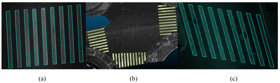 Extraction and reconstruction results of alienated zebra crossings. (a) Regular zebra crossing. (b) Zebra crossings with varying lengths or fewer stripes. (c) Parallelogram zebra crossing.