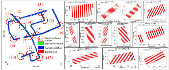 Statistical analysis reveals that the 3D reconstruction time for each zebra crossing area is less than 1 s. From 12 representative zebra crossing areas selected for the experiments, one region containing several zebra stripes was randomly chosen from each as a comparison area, where the actual boundaries of each stripe were manually annotated. The degree of overlap between the algorithmic extraction results and the manual annotations for these 12 comparison areas is illustrated in Figure 9. Each zebra stripe reconstructed by the algorithm is bounded by four sequentially ordered vertices. For each stripe, the planar distance and elevation difference at the vertex are denoted as and , respectively. The average differences between these vertex indices are expressed as /; the overall means for a single comparison area, /, Intersection over Union (IOU), precision, recall, and F1 score, along with the total average value across all comparison areas, were used to evaluate the accuracy of the algorithm (where precision, recall, and the F1 score are calculated based on the number of point clouds encompassed by the zebra stripes). The results are presented in Table 3. It can be seen that the overall IoU for the sampled zones reaches 0.89, with the maximum error in average corner point plane positions being within 0.07 m and most errors within 0.05 m. Since the algorithm primarily extracts points from zebra crossings or nearby ground areas, the average error in corner point elevation is relatively small, approximately 0.01 m.
