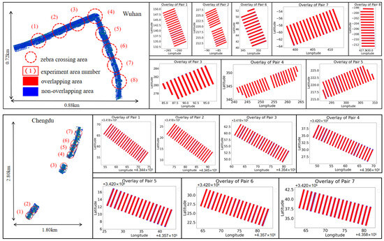 Point cloud data from eight roads in Shanghai were selected as the experimental subjects. These point clouds were extracted from the annotated WHU-Urban3D dataset [53] to facilitate accuracy comparison. This dataset encompasses various data types, including ALS point clouds, MLS point clouds, and panoramic images, all of which have undergone coordinate unification and registration. Specifically, the MLS data span over 6.5 × m and includes additional attribute information such as intensity and number of returns, providing over 600 million per-point semantic and instance labels. The specific dataset utilized in this article is the Shanghai portion of the MLS-S dataset, obtained from the AS-900HL multi-platform LiDAR measurement system. The MLS-S dataset comprises 12 representative zebra crossing areas. The data distribution is illustrated in Figure 2, and the system’s specific parameters are listed in Table 1. Additionally, to further verify the robustness of the algorithm, we also conducted experiments using MLS point clouds obtained from other data acquisition platforms in Wuhan and Chengdu.