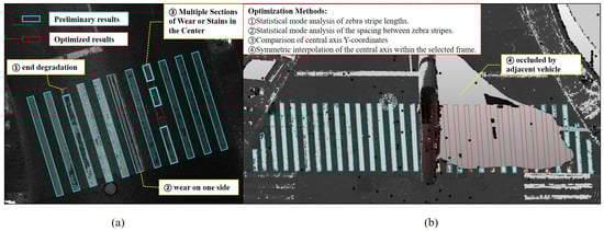 The algorithm utilized in this study employs a pre-selection RoI process facilitated by human–computer interaction. Since the selected area is typically small, it is not sensitive to point cloud density and reflectance intensity contrast, thereby bypassing the challenges associated with global multi-threshold settings and enabling adaptive computations. Additionally, it exhibits robustness in extracting zebra crossings, even in the presence of partial degradation, occlusion, and interference from other ground objects. Even severely occluded zebra crossings can benefit from satisfactory interpolation and symmetrical completion effects using this algorithm. For example, Figure 11a demonstrates a typical zebra crossing, featuring degradation and wear at the ends, multiple areas in the middle, and on one side. By utilizing mode statistics and comparing the y-coordinates of the central axis, our algorithm optimizes the reconstruction results, achieving a desirable level of accuracy. Similarly, in Figure 11b, a large blank area appears on the right side due to the parallel movement of other vehicles during scanning. To address this, the algorithm incorporates the concept of axial symmetry during the optimization phase, enabling the interpolation of the reconstruction results.