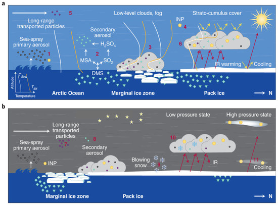 Different relevant processes during polar day (a) and polar night (b). The numbers indicate (1) sea spray formation; (2a–b and 8) (non-)marine secondary aerosol formation; (3) particle processing in fog; (4) Arctic Ice Nucleation Particles (INP) concentrations; (5 and 7) Long-range transport; (6, 10 and 11) cloud formation; (9) blowing snow. Figure is adapted from Schmale et al. [14].