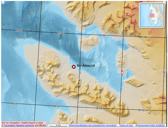 Map of Ny-Ålesund on Svalbard in the European Arctic (source: Svalbardkartet (https://geokart.npolar.no/Html5Viewer/index.html?viewer=Svalbardkartet, accessed on 2 October 2024)); courtesy of Norwegian Polar Institute.