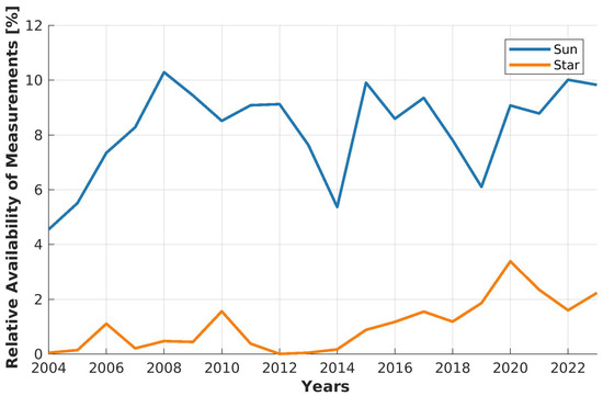 Relative availability of cloud-screened measurements over the course of a year separated between sun and star photometer.