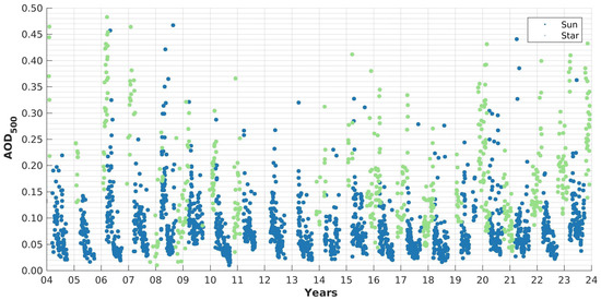 The available data is presented in Figure 4, where each point is the daily median AOD. The daily AOD is generally low and the star photometer fills the gaps of polar night. We notice a large variability from year to year, especially for the star photometer data set (green points). This picture demonstrates the complementary nature of the two instrument datasets (sun and star photometers): One instrument fills the gaps without data of the other one. Moreover, since the gaps are very long (four months polar day or night), Figure 4 demonstrates, how important it is, to have in polar regions as well an instrument operating during the night (star photometer) as operating during the day (sun photometer).
