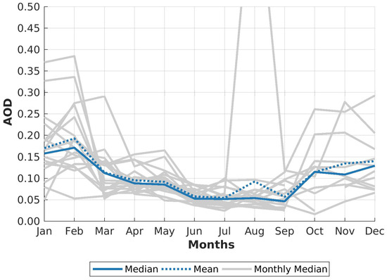 The monthly median values for the AOD is shown for each year of 2004–2023 in grey. The blue lines indicate the median (solid) and mean (dashed) of these values.