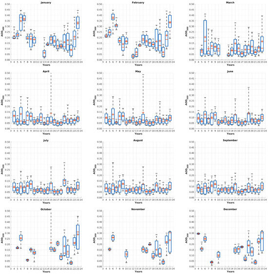 Figure 5 gives an overview of monthly median AOD observations over the entire measurement period 2004–2023. A detailed distribution for every month and year is provided in Figure 6.