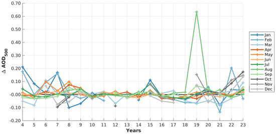 Over the entire observation time (2004–2023), the months April to June and especially May became clearer with a reduction in up to , while the AOD in October and November increased with up to . In agreement with Figure 5, the standard deviation is larger for winter and smaller for summer with values around 0.02 (June), indicating that the monthly median AOD in summer changed less from year to year than in winter (0.09 in February). A significant decrease in AOD can be found in January and February. When also taking Figure 6 into account, it can be seen, that this trend happened until the year 2020. Afterwards, a constant increasing of AOD is observed. Therefore, this linear trend only reflects roughly real changes. Generally, it can be seen that autumn becomes more polluted, while a small decrease in AOD can be found during spring.