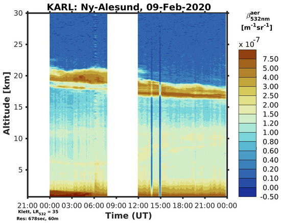 Polar Stratospheric Clouds (PSC) can occur in the Arctic lower stratosphere, when the temperature drops below 195 K. PSCs provide the surface, on which chemical reaction can take place to form free chlorine radicals, which directly destroy ozone molecules. Due to the required low temperatures of the atmosphere, they are typically observed in Ny-Ålesund between December and February [30]. While the global temperature in the troposphere increases significantly due to climate change, the stratosphere cools down at the same time [31]. This effect enhances the probability of PSC formation. Therefore, it is not trivial to directly transfer older studies like [32,33] to today’s occurrence probabilities of PSCs. Since these stratospheric clouds occur above Ny-Ålesund only during winter, when in parallel the AOD is significantly higher than during summer time, we estimate the possible impact of a PSC to star photometer observations. To obtain a height-dependent information about the PSC, we use additional Raman Lidar data. By measuring the back-scattering coefficient of aerosol and cloud layers, distinct and different layers can be identified. The presented ground-based observations (Figure 8) by the Raman Lidar KARL (Koldewey Aerosol Raman Lidar), which is operated manually from Ny-Ålesund, shows one exemplary day with a thick and persistent PSC in February 2020. The temporal resolution is 10 min with a spatial resolution of 60 m. More information about the Raman Lidar KARL can be found at Hoffmann [34]. A rough estimation of the AOD can be obtained from the extinction coefficient measured of a Raman Lidar. More information about the calculation of the AOD are described by Herrmann et al. [35].