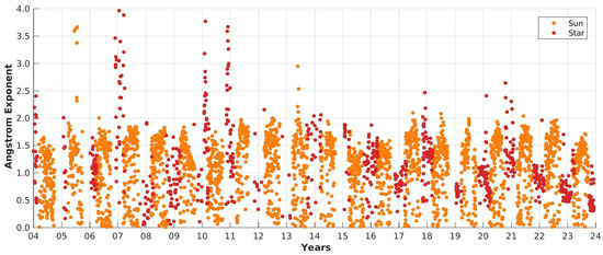 Similar to Figure 4 (for AOD), Figure 9 shows the daily median Ångström Exponent for both instruments from 2004–2023. As can be seen, most of the values concentrate within the range of . Some exceptions are recorded for values .