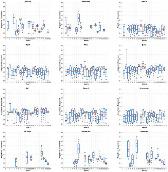 A more detailed overview of monthly median values is given in Figure 11 for the entire measurement period in grey. In orange over all these 20 years the lines for median (solid) and mean (dashed) are plotted. A more detailed distribution characteristics of the Ångström Exponent is presented in Figure 12. Generally, aerosols in the atmosphere above Ny-Ålesund are larger in winter times with a corresponding higher AOD than in summer times. The same result was also found by Gogoi et al. [37], who measured scattering coefficients at the surface.