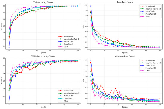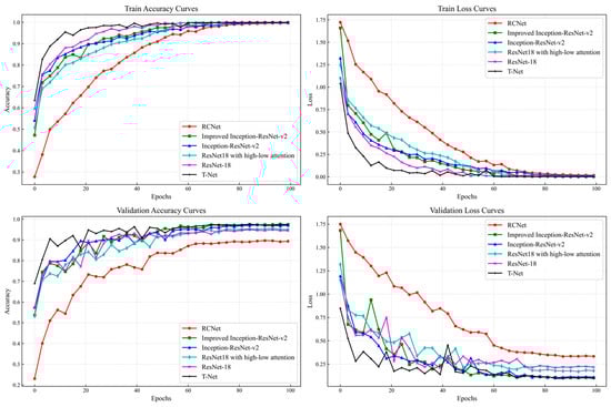 - To overcome the limitations of existing RSC recognition methods, a novel model, T-Net, was proposed. It adopts a split-transform-merge paradigm with four distinct branching blocks, multiple attention mechanisms, and three trainable classification heads, allowing it to capture the diversity and complexity of the RSCs. Meanwhile, in order to fill the research gap and answer the question of which structure or architecture of the deep-learning model should be selected for an RSC recognition scenario, the performance differences of deep learning neural networks with different structures and architectures were explored and analyzed.