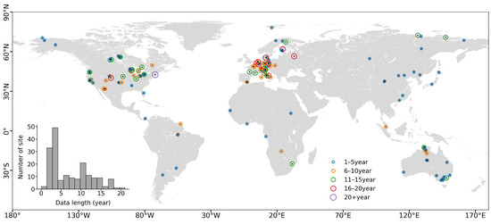 Map of 128 tower sites included in this paper from the FLUXNET2015 dataset. The size of the circle indicates the length of the data record. The inset shows the distribution of data record lengths.