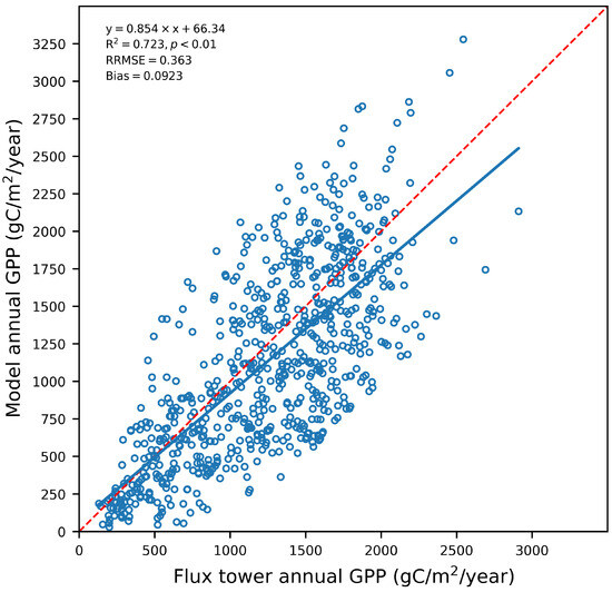 Comparison of annual GPP estimated from flux towers and annual GPP simulated by the proposed model. The blue line is the regression line, and the red dashed line is the 1:1 line. The regression equation, correlation coefficients, statistical significance, relative mean square error, and bias are shown on the top.