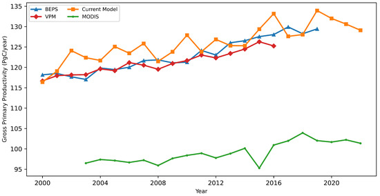 The long-term trend of annual global summed GPP simulated by the proposed model, BEPS [71,72,73], MODIS [27], and VPM [3] shows an increase over the time series (Figure 4). The proposed model quantified the annual global GPP between 116.4 and 133.94 , averaging 125.93 from 2000 to 2022. In contrast, the BEPS model produced annual global summed GPP estimates ranging from 117.04 to 129.92 , averaging 122.98 from 2000 to 2019. Additionally, the MODIS model simulated annual global summed GPP ranging from 95.28 to 103.92 , averaging 99.1 from 2003 to 2022. Lastly, another VPM model simulation of annual global summed GPP spanned 116.67 to 126.29 , averaging 121.09 from 2000 to 2017. We found a significant increasing trend for the proposed model, BEPS, MODIS, and VPM, with average increase rates of 0.548 , 0.685 , 0.34 , and 0.53 globally, respectively. A significance test of the increasing trend showed that all p values were below 0.01. The GPP values estimated by the proposed model showed correlations of 0.767, 0.765, and 0.657 with those of the BEPS, VPM, and MODIS models, respectively. All significance test p values were below 0.01 (Table 3).