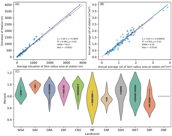 (A) Comparison of site elevation and the average elevation within a 5 km radius area of the site. (B) Comparison of annual average site LAI and annual average LAI within a 5 km radius of the site. The blue line is the regression line, and the red dashed line is the 1:1 line. The regression equation, correlation coefficients, statistical significance, mean square error, and bias are shown on the bottom. (C) The proportion of vegetation types at the site relative to vegetation types within a 5 km radius of the site. WSA: woody savannas; SAV: savannas; GRA: grasslands; EBF: evergreen broadleaf forests; CRO: croplands; MF: mixed forests; ENF: evergreen needleleaf forests; OSH: open shrublands; WET: permanent wetlands; DBF: deciduous broadleaf forests; DNF: deciduous needleleaf forests).