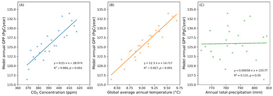 Correlations between global GPP and (A) annual mean atmospheric concentration, (B) global annual mean temperature, and (C) global annual precipitation.