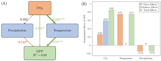 The basic usage of structural equation modeling (SEM) in path analysis with mediation. (A) The causal relationships include total effects and their corresponding path coefficients. The acronyms in the models are carbon dioxide (), air temperature (Temperature), GPP, and Precipitation. * indicates statistical significance (p < 0.05), and *** indicates extremely significant (p < 0.001). Model fit was assessed using Shipley’s test of d separation (Fisher’s C = 0.104, df = 2, p = 0.95). (B) Standardized effects of driving factors (, Temperature, and Precipitation) on GPP.