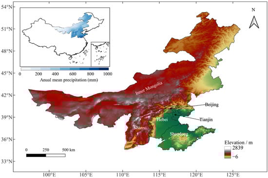 The study region encompasses North China (Figure 1). Specifically, this study focuses on the six provincial-level administrative units that make up North China: Beijing, Tianjin, Shanxi, Shandong, Hebei, and Inner Mongolia. This region covers an area of approximately 1.3 million km2 and had a population of 359 million in 2010 [22]. The North China Plain features a warm temperate monsoon climate, with hot rainy summers and cold dry winters. Mean annual precipitation ranges from 400 to 800 mm, decreasing from southeast to northwest across the region. Major ecosystem types include cultivated land, forests, grasslands, and inland water bodies. Forests are concentrated in mountainous areas while agriculture dominates the fertile plains. The main land cover changes in recent decades have been agricultural expansion, reforestation, and urban growth [23].