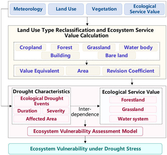 This study employs a three-step methodology: data processing, land use type reclassification, ecosystem service value (ESV) calculation, and the construction of an ecosystem vulnerability assessment model (Figure 2). The data processing step involves the integration of meteorology, land use, vegetation, and ecosystem service value equivalent data, providing the necessary foundation for land use type reclassification, ESV calculation, and drought characteristics identification. The assessment of ESV is a crucial component of the research, serving as input for the vulnerability assessment model. By establishing an evaluation model, the spatial distribution of vulnerability under drought stress is determined for the study area.