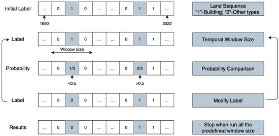 For temporal inconsistencies, this study mainly resolved instability in built-up land over time, such as cases where a pixel was classified as built-up land in 2000 and 2002 but forest land in 2001. Therefore, sliding windows of a certain step size were used to calculate the temporal consistency probability of each pixel, thereby enabling correction of deviations in the classification results [14] (Figure 3).