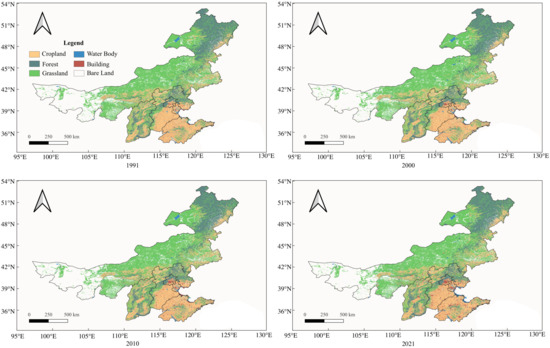 We have generated 1 km resolution land use datasets across North China spanning the period from 1991 to 2021. Figure 4 shows the spatial distribution of land use types in North China for typical years 1991, 2000, 2010, and 2020. It can be seen from the figure that grassland is mainly concentrated in central Inner Mongolia, and forest is mainly in northeast Inner Mongolia and central Shanxi. Cropland mainly concentrates in southern Hebei and Shandong.