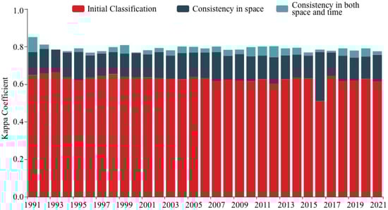 The Kappa index was computed for three different modes. As shown in Figure 5, the accuracy of the land use classification without post-processing is relatively low. The classification that considers only spatial consistency shows moderate improvement, while the classification that takes both spatial and temporal consistency into account achieves the highest accuracy. The improvement in accuracy ranges from 0.12 to 0.26.