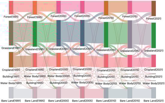 Sankey diagram of land use changes in North China from 1991 to 2021.