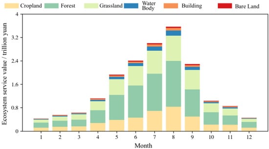 ESVs were highest in August and decreased towards winter, except for building and bare land, which were temporally stable. The peak in summer coincides with the rainy season and peak plant growth (Figure 11). Water bodies reached maximum values of CNY 0.14, 0.18, and 0.11 trillion in July, August, and September, reflecting the influence of precipitation on its ESV. The seasonal distribution of ESV peaked in August and decreased towards winter, reflecting the influence of monsoonal climate and ecosystem growth cycles in the study area. In winter, low temperatures, scarce rainfall, and vegetation dormancy or mortality result in minimum NDVI and ESV. From winter to summer, rising temperatures and precipitation increase NDVI accumulation rates, enhancing ecological functions and ESV. From summer to winter, declining temperatures slow or halt biological growth, reducing ESV. These seasonal impacts are most pronounced for forests and grasslands, followed by croplands. The ESV of water bodies mainly depends on intra-annual rainfall distribution, peaking in July-August with high precipitation, indicating a higher per-unit-area ESV under favorable water and temperature conditions for vegetation growth, and vice versa.