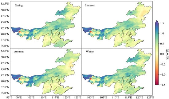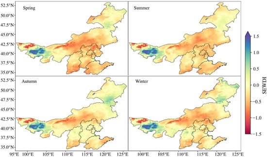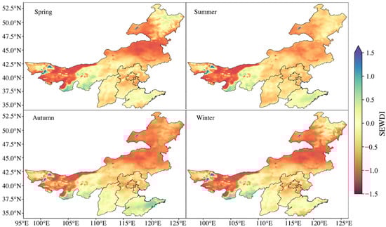 By calculating the ecological drought index, this study analyzed the spatiotemporal variation of ecological drought in spring, summer, autumn, and winter in North China during three periods from 1991 to 2021 (1991–2001, 2002–2011, and 2012–2021) (Figure 12, Figure 13 and Figure 14). The results show that 1991–2001 was a relatively wet period for the whole region; 2002–2011 was the most severe ecological drought phase in the past 30 years, especially in central and eastern Inner Mongolia; and there was some relief in 2012–2021.